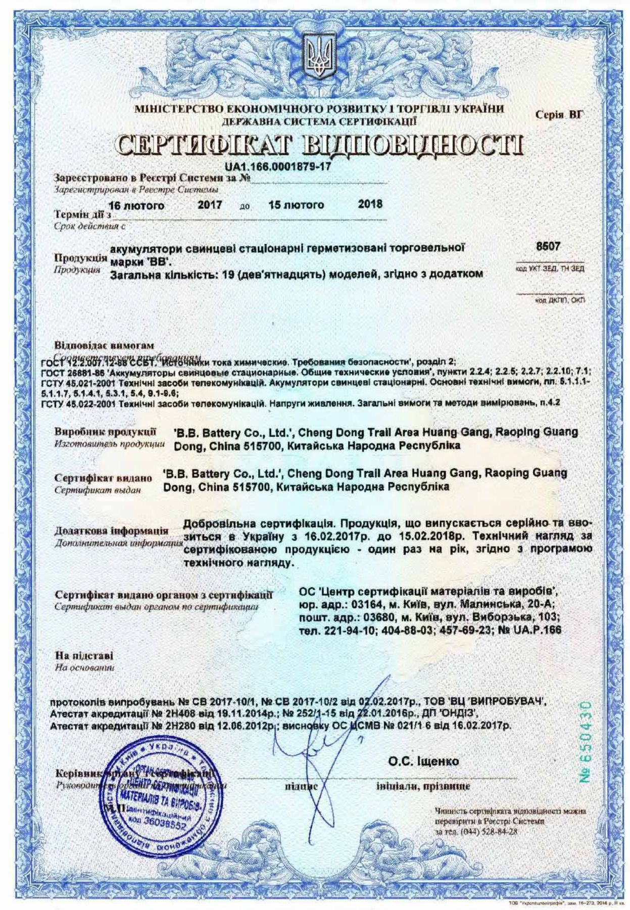 BB Battery BP100-12 AGM – имеет украинский сертификат соответствия (УкрСЕПРО), что подтверждаете его высокое качество и полную техническую безопасность в использовании.