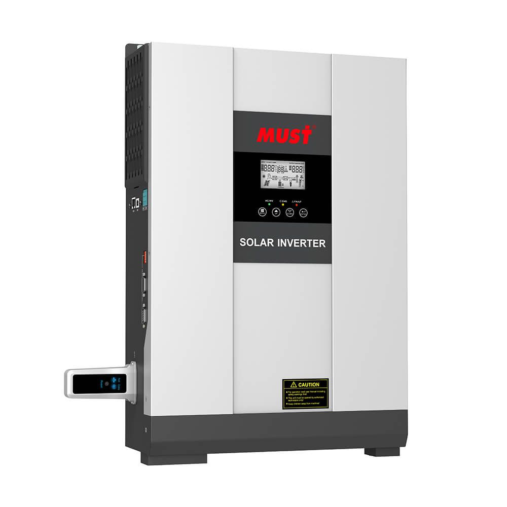 Гибридный инвертор PV18-5048 VHM Must - это универсальный инвертор, сочетающий функции инвертора, солнечного зарядного устройства для аккумулятора и контроллера заряда, чтобы обеспечить постоянное питание электрических устройств. -дисплей отображает всю информацию о рабочем состоянии, входных и выходных величинах, а также позволяет настроить рабочие параметры, такие как ток зарядки батареи, приоритет переменного/солнечного зарядного устройства и приемлемое входное напряжение на основе различных программ. на АКБ 48 В, технология заряда MPPT (ВТМП) и зарядным током до 80 А. Имеет выход для подачи сигнала на АВР генератора (для автоматического запуска генераторов). Новая модель гибридного инвертора с улучшенными показателями максимального напряжения холостого хода СБ -145В и максимального тока заряда - 80А. Инвертор "смешивает" энергию от солнечных батарей и от городской сети.