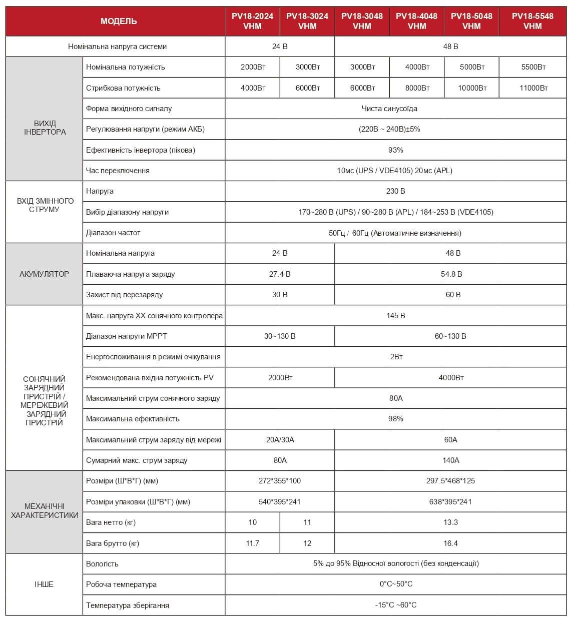 ТЕХНИЧЕСКИЕ ХАРАКТЕРИСТИКИ Must PV18-5048 VHM: |