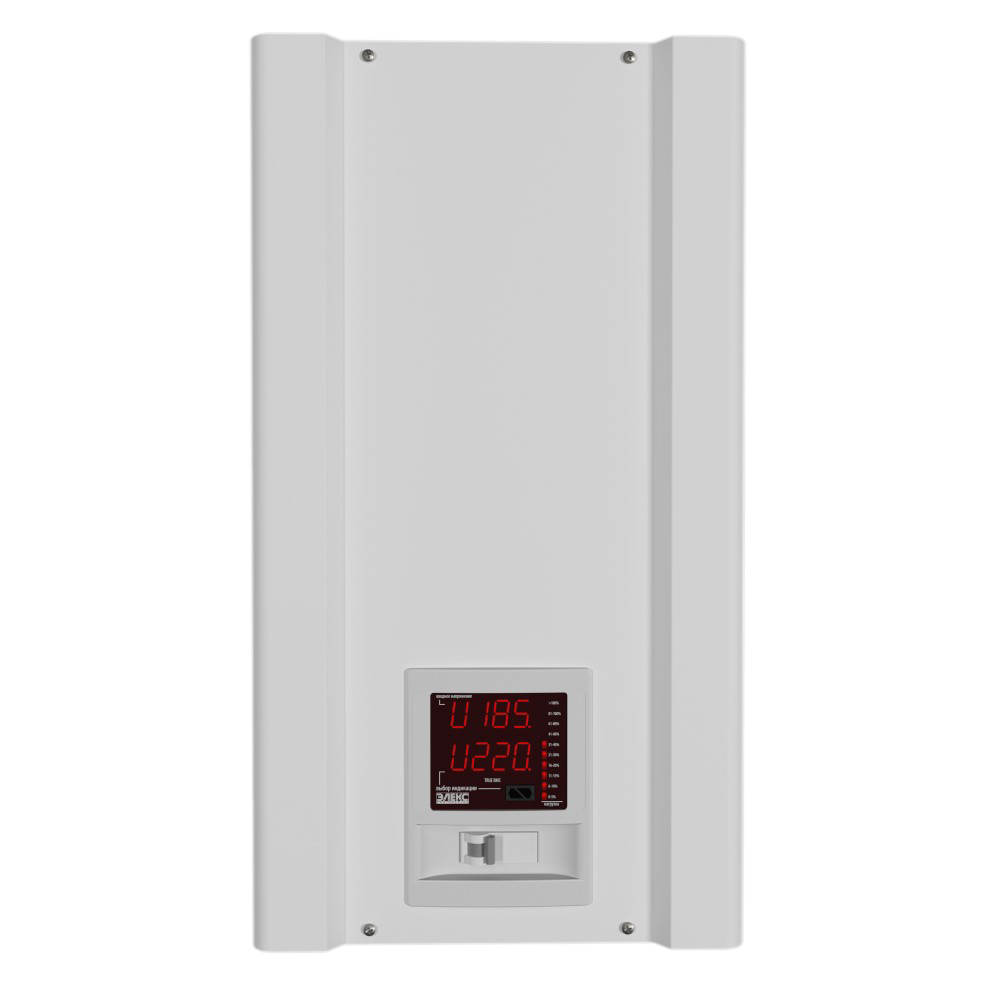 К особенностям данного стабилизатора можно отнести двойной светодиодный экран, линейную полосу загрузки, наличие электронного транзита (байпас), удобное расположение клеммной колодки для подключения на задней части корпуса, бесшумную работу за счет использования в качестве силовых ключей симисторов.
