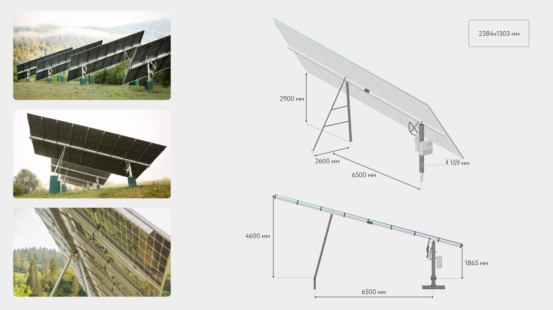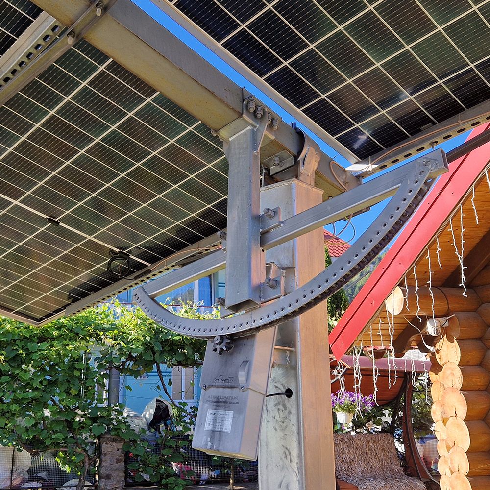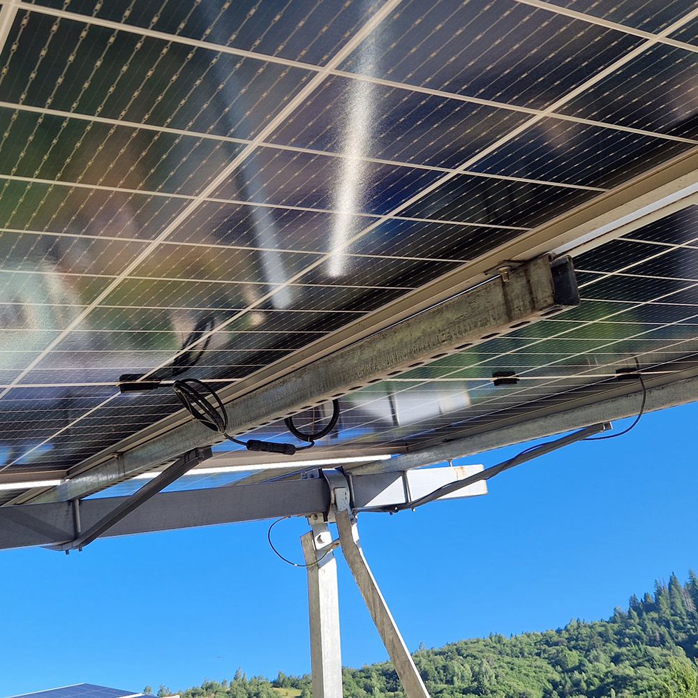 Оптимизация под двусторонние панели. Конструкция трекера изготовлена из оцинкованной стали, а рама имеет уникальное решение крепления панелей вдоль длинной стороны. Это позволяет полностью использовать обратную сторону двусторонних солнечных панелей, что добавляет до 10% годового производства энергии. В сочетании с трекером общий прирост генерации может достигать до 45%, особенно при установке на светлых поверхностях.