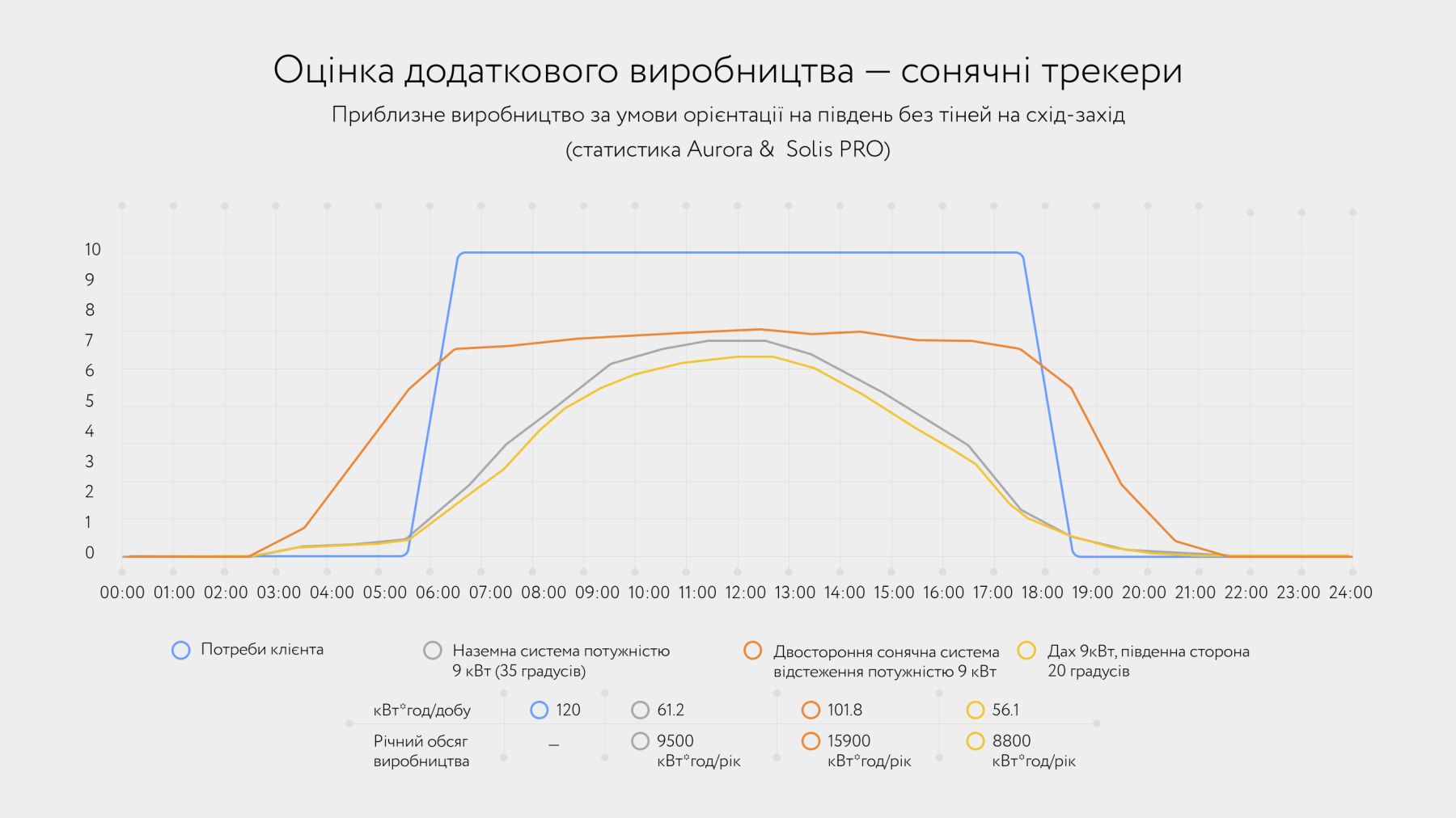 Солнечные трекеры, ориентированные на юг и установленные без затенения с востока или запада, являются идеальным решением для объектов, где отсутствует надежная крыша. Они обеспечивают равномерное производство электроэнергии в течение всего дня, включая утренние и вечерние часы, что повышает общую эффективность системы. В отличие от традиционных кровельных или наземных установок, солнечные трекеры производят электроэнергию именно тогда, когда она стоит дороже всего — утром и вечером. Это позволяет сэкономить до 70% затрат на электроэнергию по сравнению с обычными системами.