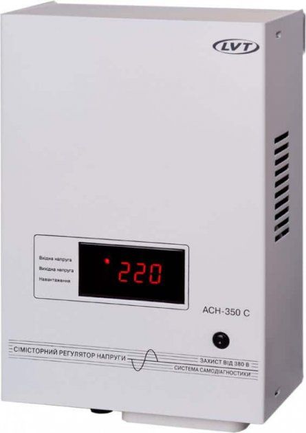 Автоматический симисторный регулятор напряжения LVT АСН-350 С предназначен для работы с бытовыми электроприборами с потребляемой мощностью до 350 Вт от сети 220 В, 50 Гц. Он обеспечивает автоматический контроль и регулирование напряжения сети, а также защиту от пониженного и повышенного напряжения и высоковольтных импульсов.