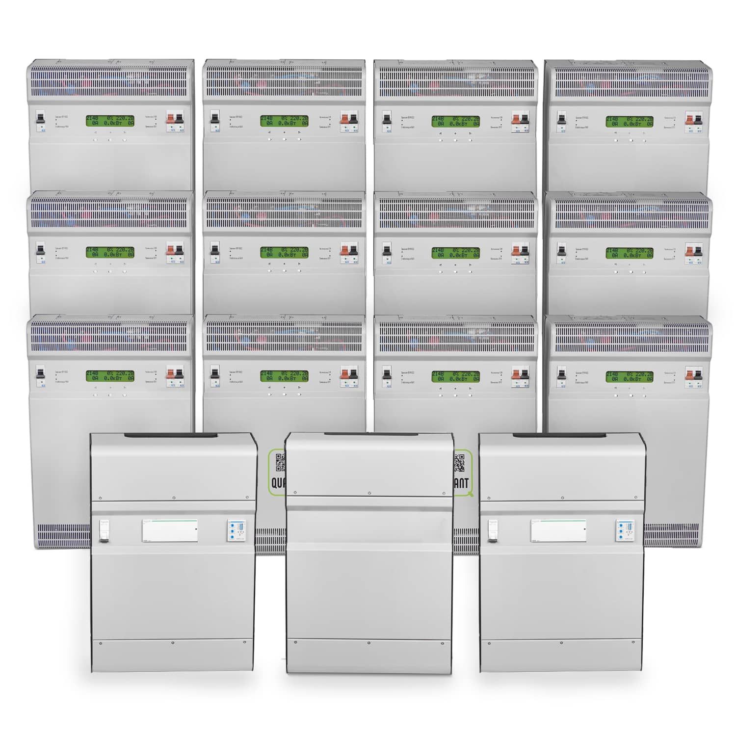 Quant-168 - трехфазный стабилизатор с возможностью однофазной работы и имеющимся сумматором мощности фаз (со встроенным блоком контроля фаз). Quant-168 - это двенадцать однофазных инверторных стабилизаторов напряжения Quant-14, которые работают с сумматором мощности. Главное отличие Quant-168 от обычного трехфазного стабилизатора без синхронизатора фаз в том, что он защищает трехфазное оборудование при неисправной трехфазной сети.