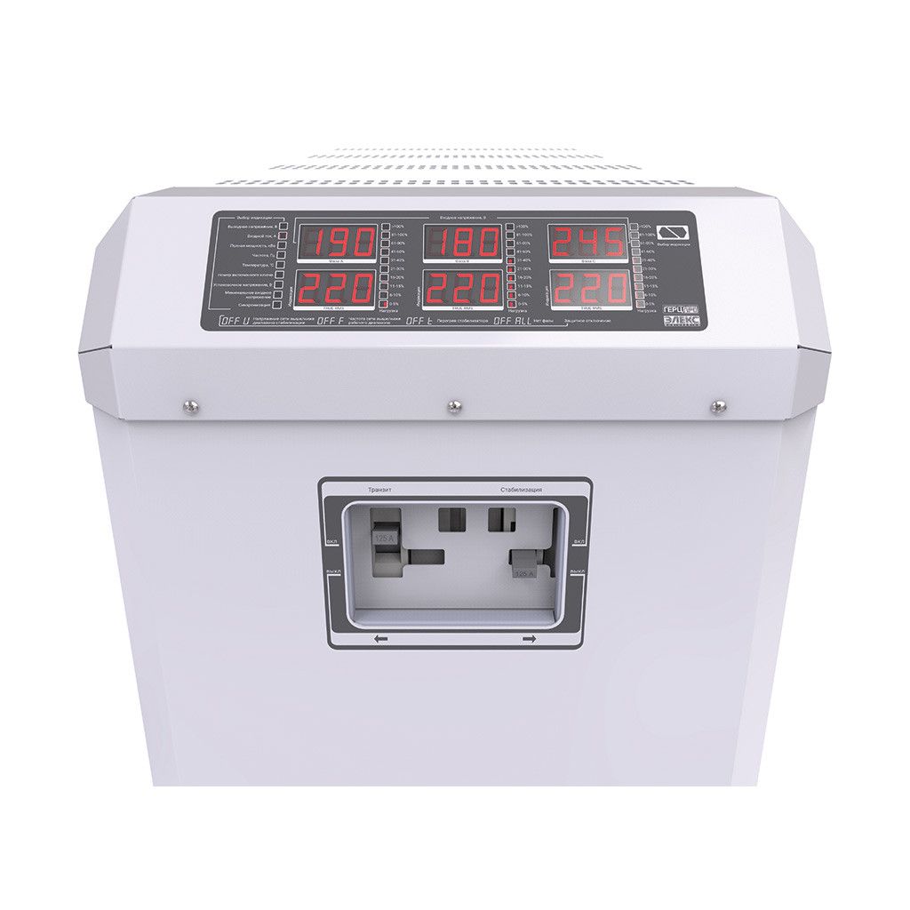 До особливостей даного стабілізатора можна віднести подвійний LED-індикатор на фазу, лінійна смуга завантаження, наявність механічного транзиту (байпас), підлогове виконання, наявність вхідних і вихідних фільтрів для захисту від високочастотних перешкод, безшумну роботу за рахунок використання тороїдальних трансформаторів та тиристорних ключів. При необхідності отримати на виході стабілізатора напруга відмінна від 220В в Герц є функція регулювання даного значення в діапазоні 200-230В. В ручному режимі можна поміняти напруга на виході з кроком 1В. При цьому зміни будуть застосовуватися одночасно до всіх фазах.